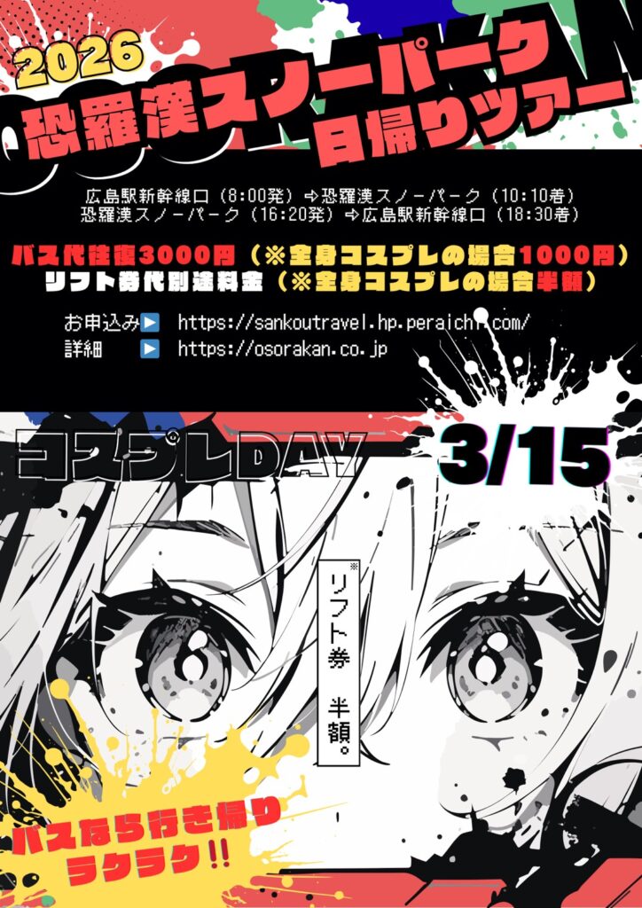 3/15(日)恐羅漢スノーパークではコスプレイベントを開催いたしますのでコスプレしていただくとバス代、リフト券代お安くなります。
